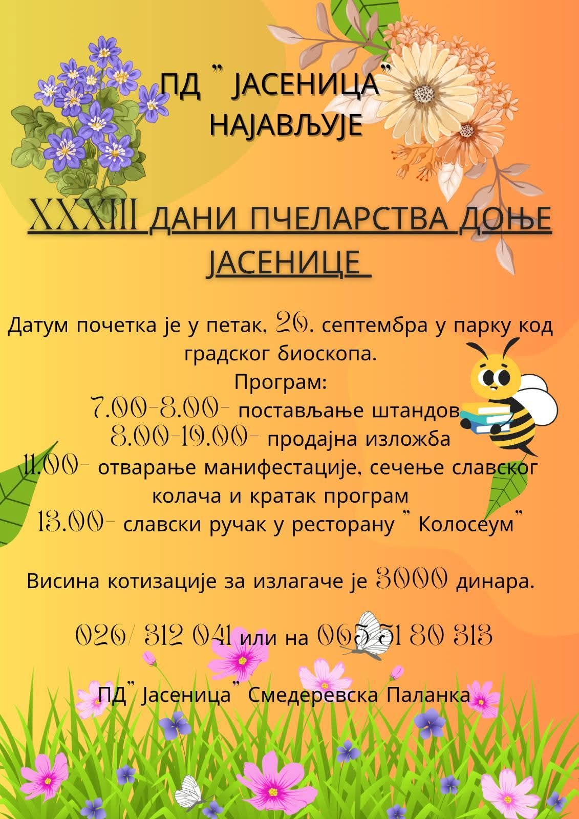 Pčelarsko društvo Jasenica nastavlja tradiciju 33. manifestacija „Dani pčelarstva Donje Jasenice “ i ove godine biće održana sutra, 26. septembra u parku kod gradskog bioskopa.