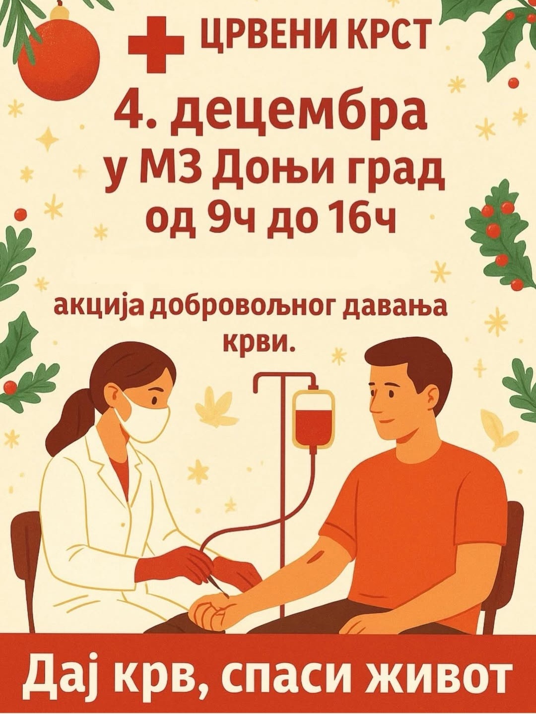 Crveni krst Smederevska Palanka organizuje akciju dobrovoljnog davanja krvi u četvrtak, 4. decembra, u prostorijama Mesne zajednice Donji Grad. Pod sloganom „Daj krv — spasi život!“, organizatori pozivaju sve građane da se odazovu i svojim gestom pomognu onima kojima je krv preko potrebna.