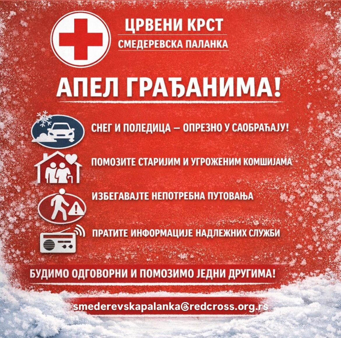 Crveni krst obaveštava javnost da usled snežnih padavina, niskih temperatura i pojave ledene kiše postoji povećan rizik po zdravlje građana, posebno starijih lica, hroničnih bolesnika i osoba u stanju socijalne potrebe.