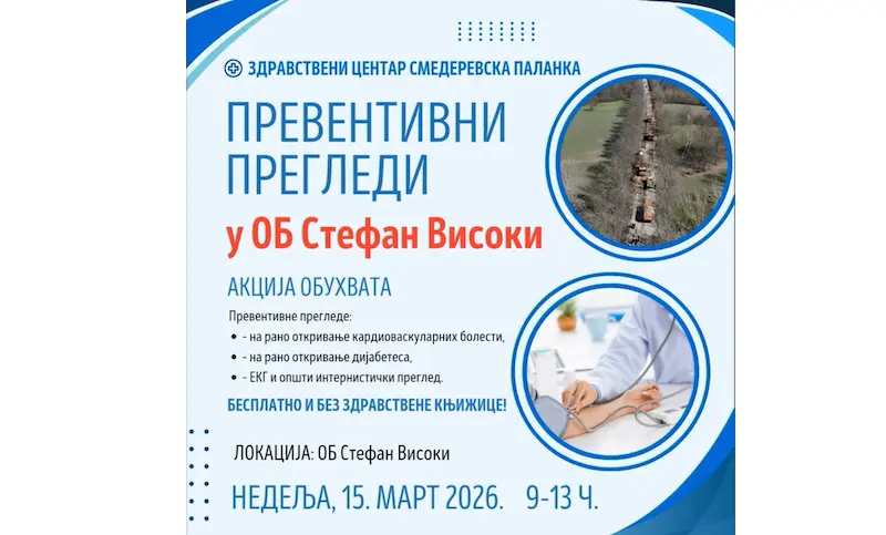 Zdravstveni centar Smederevska Palanka organizuje akciju besplatnih preventivnih pregleda namenjenu svim građanima. Pregledi će biti održani u Opštoj bolnici „Stefan Visoki“ u Smederevskoj Palanci.