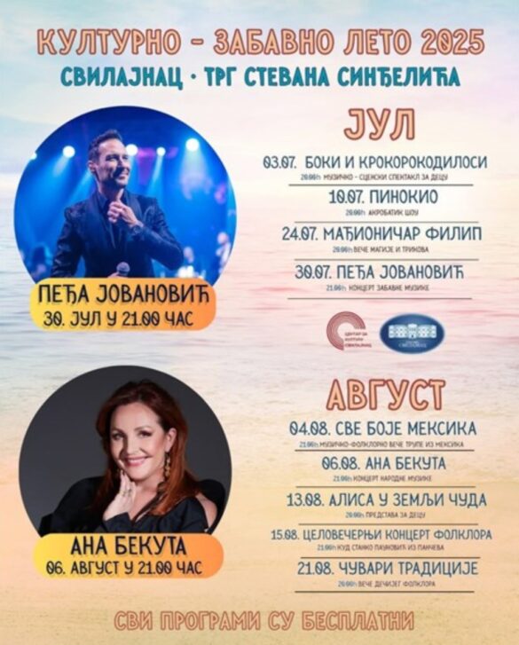 I ove godine, Centar za kulturu Svilajnac pod pokroviteljstvom Opštine Svilajnac organizuje Kulturno-zabavno leto 2025 na Trgu Stevana Sinđelića u Krivoj Čaršiji u Svilajncu.