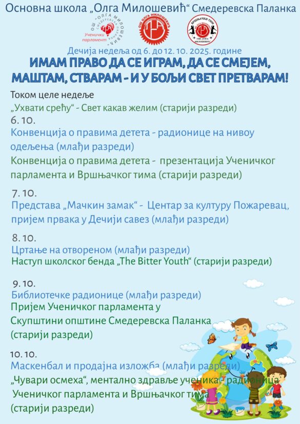 Ovaj poseban period posvećen je deci, njihovim pravima, radosti, mašti i kreativnosti. Tokom cele nedelje u našoj školi biće organizovane različite aktivnosti koje podstiču druženje, igru, učenje i razvoj.