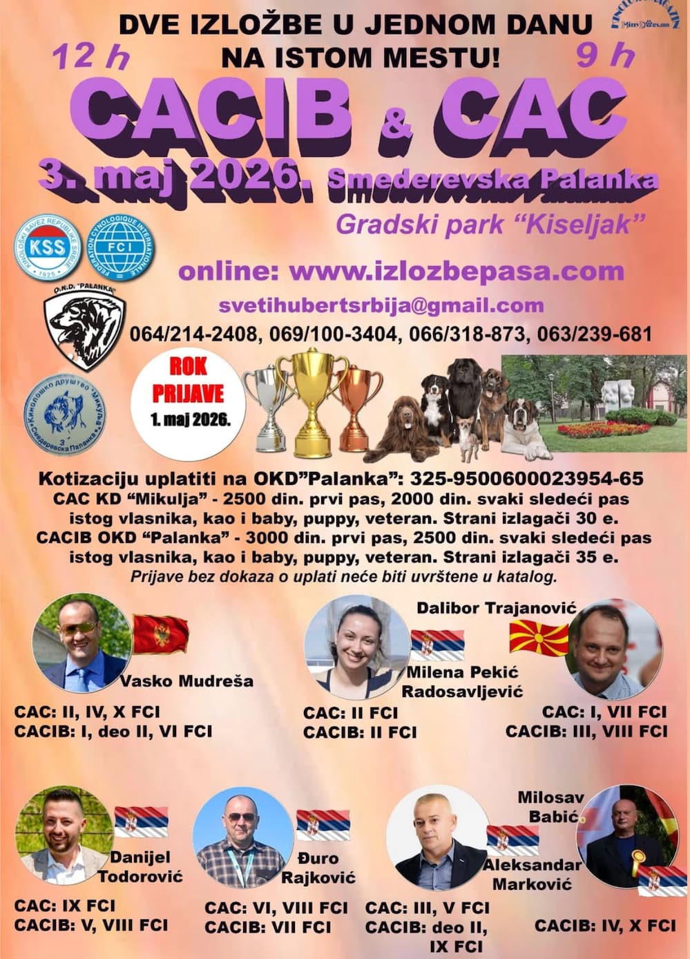Organizatori su obavestili sve zainteresovane da je rok za prijavu 1. maj 2026. godine, a prijave se mogu izvršiti putem sajta www.izlozbepasa.com ili putem mejla. Kotizacija zavisi od kategorije i broja prijavljenih pasa, a detalji su dostupni u zvaničnoj najavi.