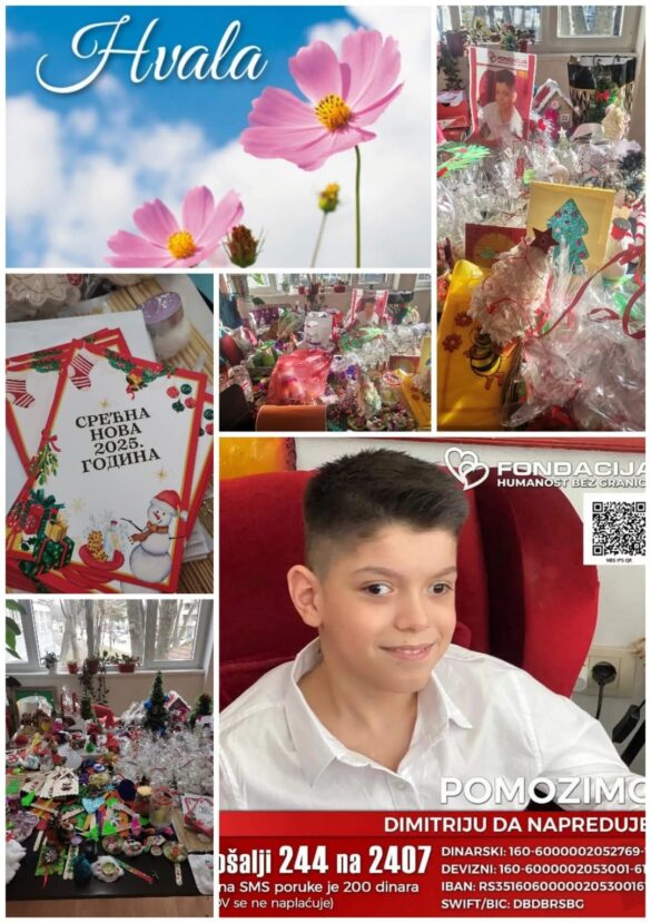 „Sve je spremno za Novogodišnji humanitarni bazar koji će se održati u ponedeljak, od 10 do 13h kod kafića Krug. Dođite u što većem broju da pomognemo našem sugrađaninu Dimitriju Cvetkoviću, da nastavi lečenje u Beogradu, jer naše malo nekome mnogo znači. Hvala svima koji su pomogli i koji nas podržavaju u našem humanitarnom radu”, poručuju iz OŠ „HIM“.