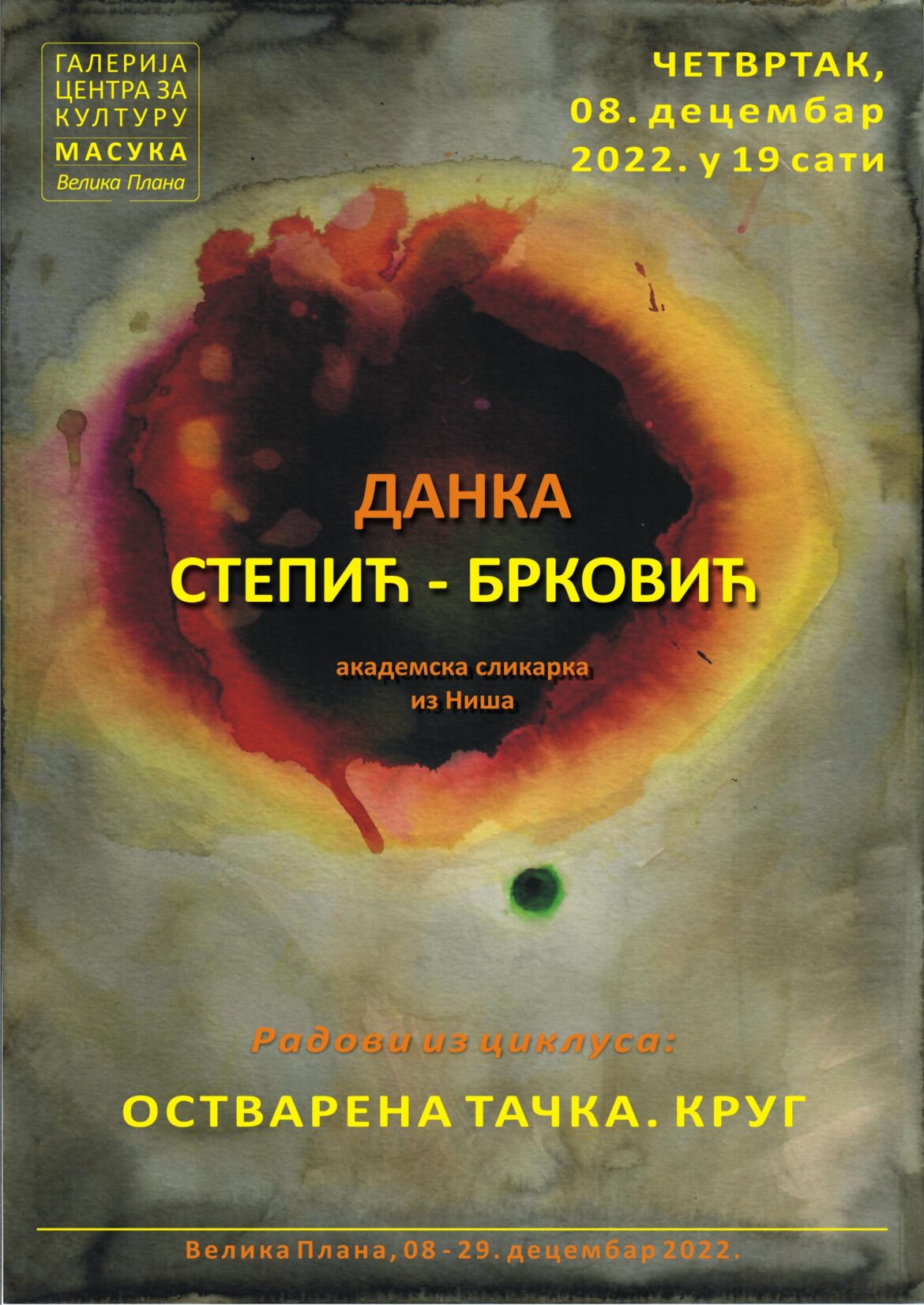 U Galeriji Centra za kulturu “Masuka” u Velikoj Plani u četvrtak, 8. decembra, u 19 časova biće otvorena izložba radova iz ciklusa “Ostvarena tačka. krug” akademske slikarke Danke Stepić Brković iz Niša.