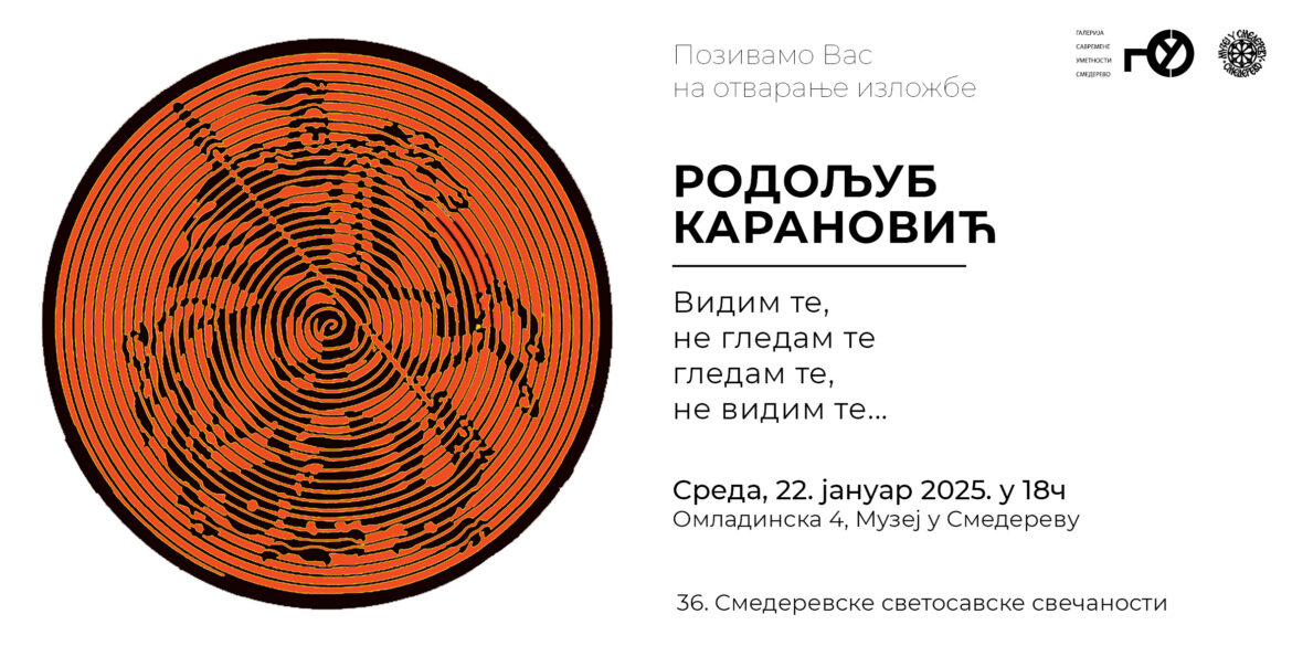 U okviru gradske manifestacije 36. Smederevske svetosavske svečanosti i godišnjeg programa Gradske galerije savremene umetnosti Smederevo u Muzeju u Smederevu sutra 22. januara biće otvorena samostalna izložba autora Rodoljuba Karanovića pod nazivom „VIDIM TE, NE GLEDAM TE, GLEDAM TE, NE VIDIM TE…“.