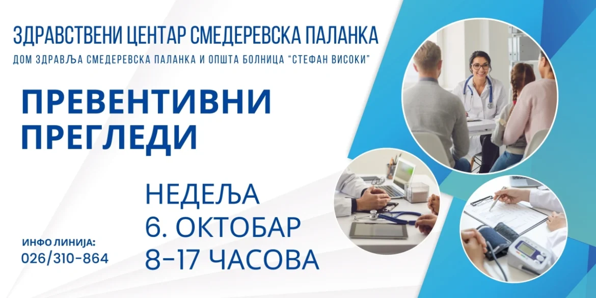 Akcija besplatnih preventivnih pregleda biće nastavljena u nedelju, 6. oktobra, u svim zdravstvenim ustanovama u Srbiji, pa tako i u Zdravstvenom centru Smederevska Palanka.