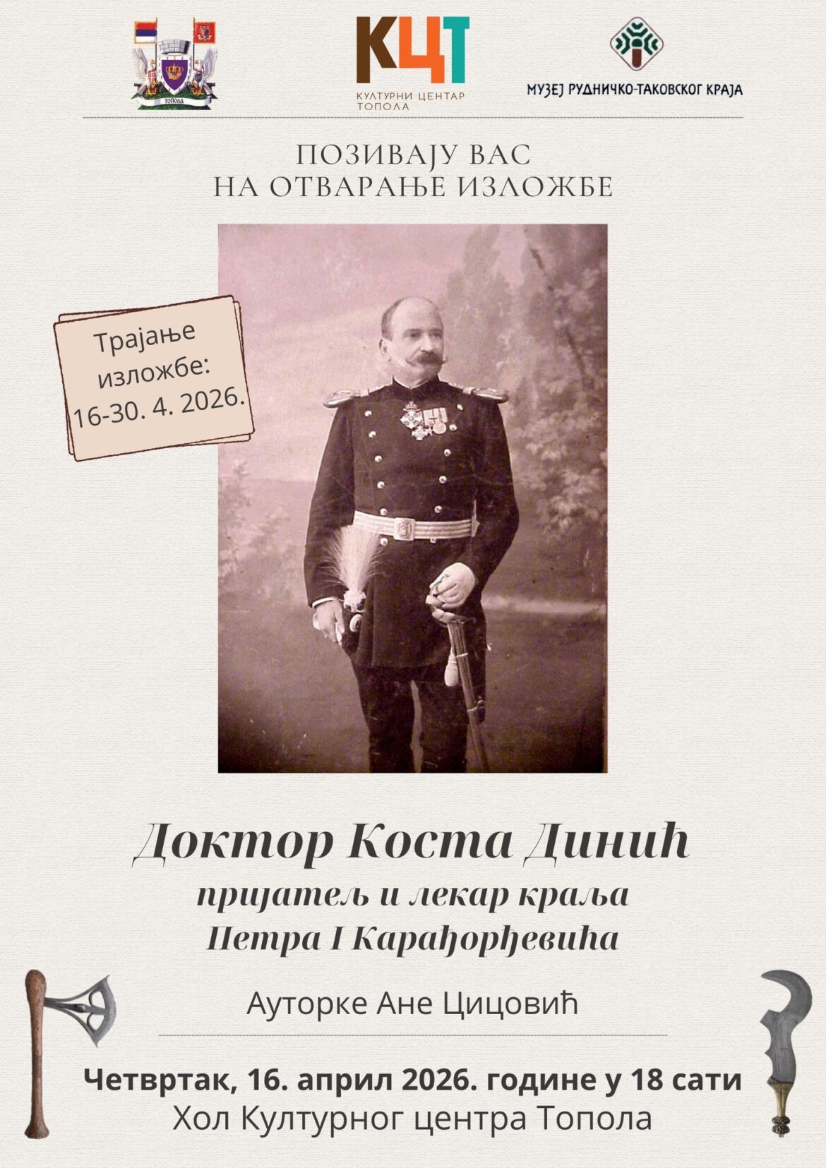 Kulturni centar Topola, u saradnji sa Muzejom rudničko-takovskog kraja, organizuje otvaranje izložbe „Doktor Kosta Dinić, prijatelj i lekar kralja Petra I Karađorđevića“.