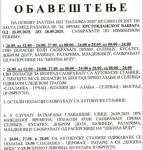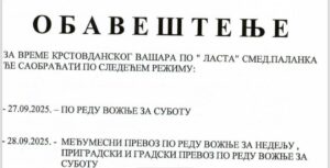 DruštvoNajnovijeSlajder Pocetna SP Lasta: Izmenjen režim autobuskog saobraćaja zbog Krstovdanskog vašara od RTV Jasenica 26/09/2025 26/09/2025 85 Podeli 0 FacebookTwitterTelegramViberEmail Prethodna vest OŠ „Vuk Karadžić”: Krstovdanska prodajna izložba u petak Naredna vest Počinje Krstovdanski vašar u Smederevskoj Palanci – izmena u režimu saobraćaja Povezane vesti Za stabilne rezerve krvi: Promotivne aktivnosti i akcije... 29/09/2025 Rezultati 7. kola Zonske lige Dunav: Đerdap zadržao... 29/09/2025 Rok za prijavu za učeničke stipendije i kredite... 29/09/2025 Danas se obeležava Svetski dan srca pod sloganom... 29/09/2025 Palanački penzioneri na Saboru u Vrnjačkoj Banji –... 29/09/2025 JKP „2020“ brzo očistilo centar grada nakon Krstovdanskog... 29/09/2025 Gorivo u Srbiji i dalje po starim cenama... 26/09/2025 SPC sutra slavi jesenji Krstovdan 26/09/2025 Dan pešačenja u Smederevskoj Palanci 27. septembar– „Korak... 26/09/2025 Turistički forum Srbije na Zlatiboru u znaku održivih... 26/09/2025