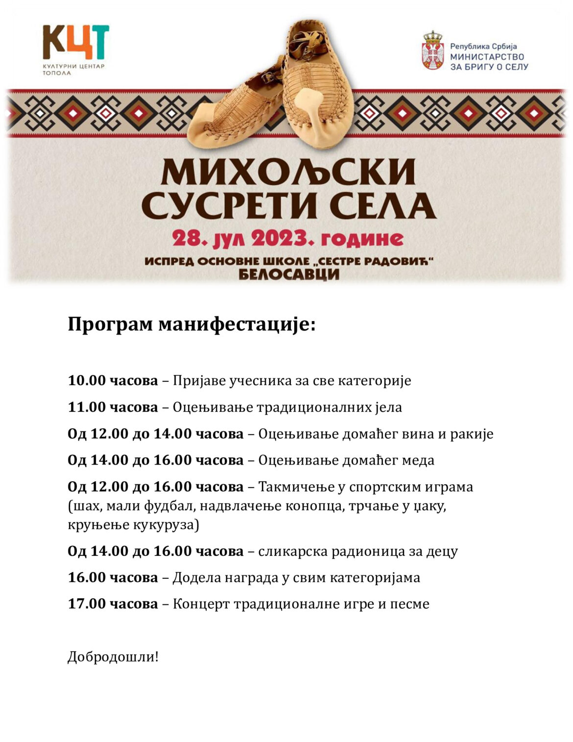 Kulturni centar Topola će, pod pokroviteljstvom Ministarstva za brigu o selu, da organizuje Miholjske susrete sela, 28. jula 2023. godine u selu Belosavci u dvorištu osnovne škole „Sestre Radović“.