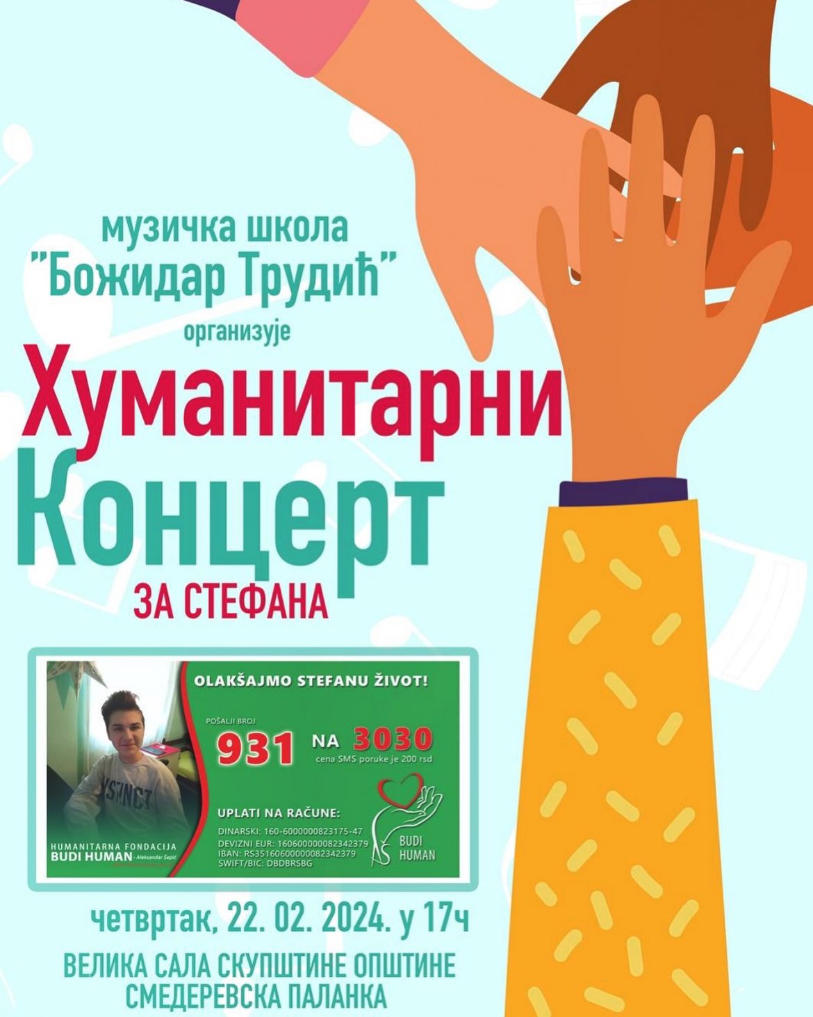 Osnovna muzička škola Božidar Trudić iz Smederevske Palanke organizuje humanitarni koncert za Stefana Radovanovića, našeg sugardjanina koji boluje od težeg oblika mišićne distrofije, a sredstva prikupljena ovim puetm biće usmerena za njegovo lečenje.