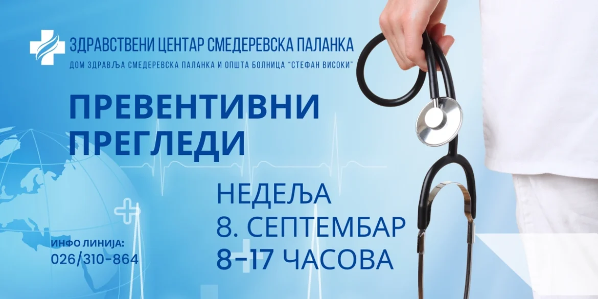 Akcija besplatnih preventivnih pregleda, koja se sprovodi u cilju rane dijagnostike i promocije prevencije bolesti, biće nastavljena u nedelju, 8. septembra 2024. godine, u većini zdravstvenih ustanova u Srbiji, među kojima je i Zdravstveni centar Smederevska Palanka (Opšta bolnica Stefan Visoki i Dom zdravlja Smed. Palanka). Zainteresovani građani će moći da se pregledaju bez uputa i bez zdravstvene knjižice.