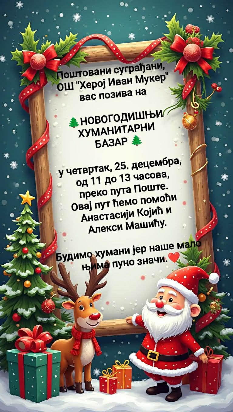Osnovna škola „Heroj Ivan Muker“ organizuje Novogodišnji humanitarni bazar koji će biti održan u četvrtak, 25. decembra, u periodu od 11 do 13 časova, preko puta Pošte.