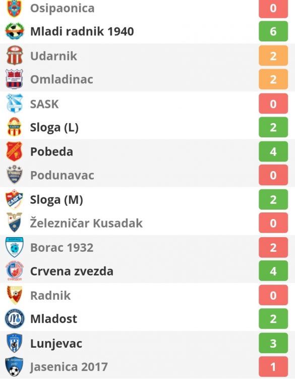 Prvi na tabeli je Mladi radnik iz Radinca sa 74 boda. Jasenica 2017 je drugopalasirana sa 61 bodom, 7. je Železničar Kusadak koji ima 43, 10. je Pobeda sa 32 i 13. je Radnik sa 18 bodova.