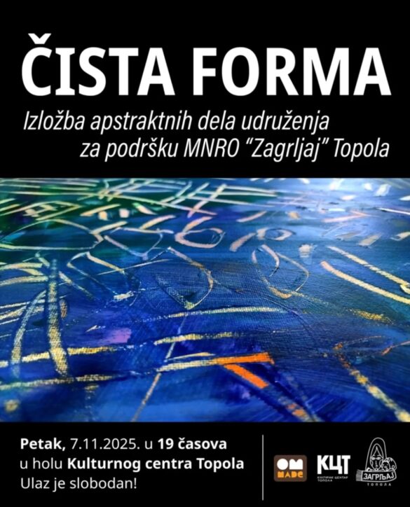 Kulturni centar Topola u saradnji sa udruženjem za podršku MNRO „Zagrljaj” iz Topole organizuje otvaranje izložbe „Čista forma” u petak, 7. novembra, u 19.00 časova u holu Kulturnog centra Topola.