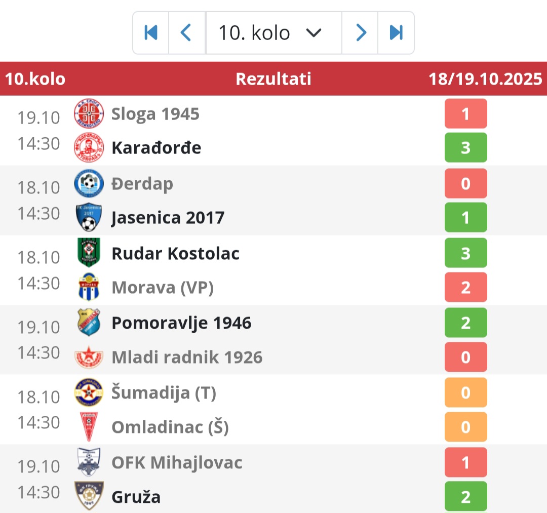 Evo i ostalih rezultata: Sloga 1945-Karađorđe 1:3, Rudar-Morava 3:2 , Pomoravlje 1946-Mladi radnik 1926 2:0, Šumadija-Omladinac 0:0 i OFK Mihajlovac-Gruža 1:2. I nakon poraza od Jasence Đerdap je prvi sa 19 bodova, dok je Jasenica 2017 šesta sa 16 bodova.