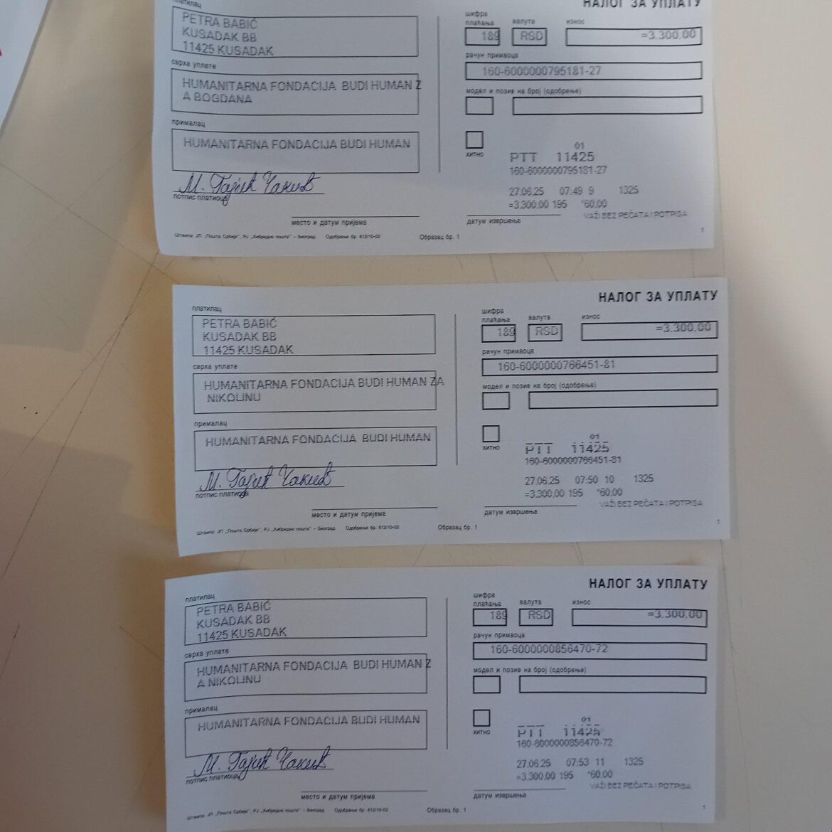 Petra Babić, učenica šestog razreda OŠ ,,Brana Jevtić” u Kusatku, izrađivala je narukvice od kojih je zaradila 10000 dinara i, po sopstvenoj želji, uplaćene su u humanitarne svrhe, za potrebe lečenja troje bolesne dece, Bogdana Rajića, Nikoline Petrović i Nikoline Kojadinović.