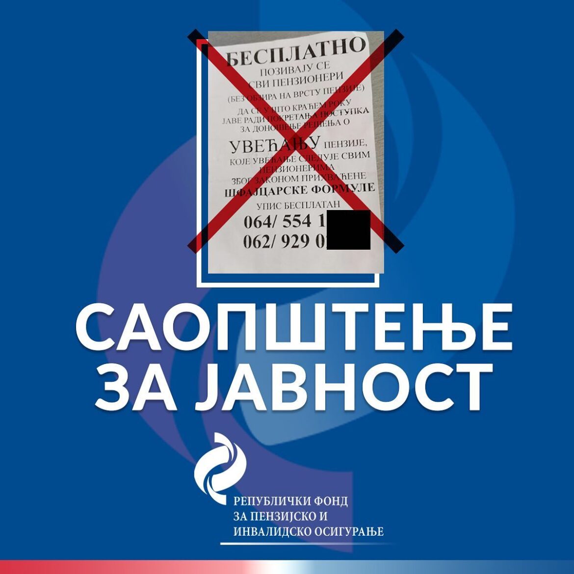 U vezi s navedenim, iz PIO Fonda skreću posebno pažnju svim korisnicima penzija i ostalih prava, kako postojećim tako i budućim, da bilo kakvo pozivanje korisnika penzija od strane raznih pojedinaca (advokati, udruženja, grupe građana … i sl.) da navedena povećanja mogu ostvariti uz njihovo posredstvo i prethodno podnošenje zahteva, jeste direktno dovođenje u zabludu penzionera, čime rizikuju određene negativne posledice, za sebe i svoje naslednike.