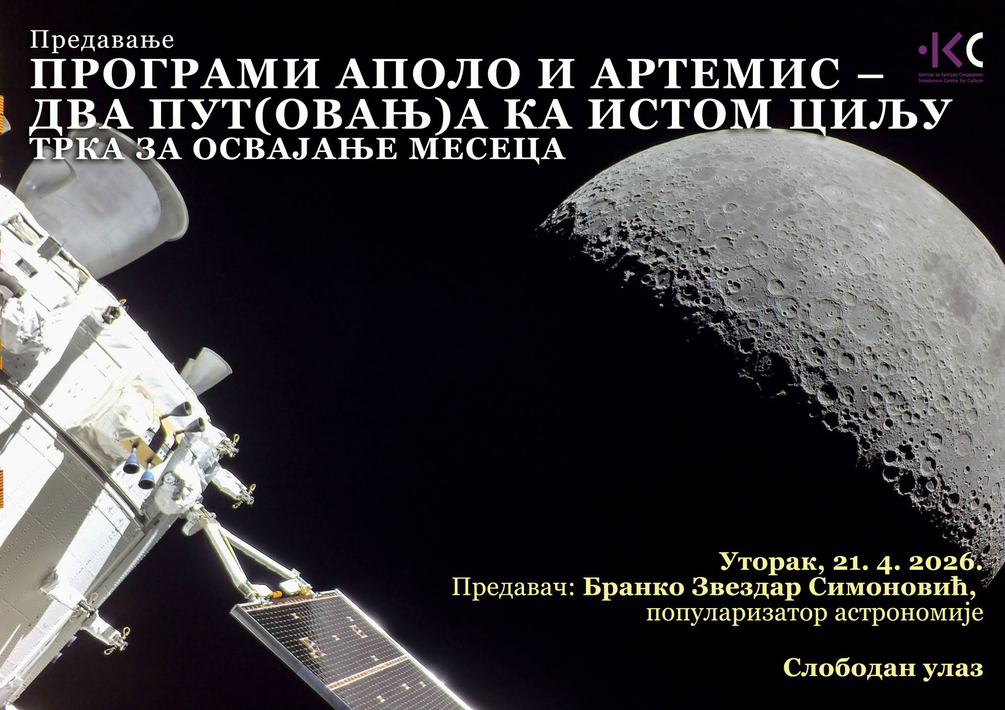 U Koncertnoj dvorani Centra za kulturu Smederevo sutra u 19 časova biće održano predavanje „Programi Apolo i Artemis – dva putovanja ka istom cilju. Trka za osvajanje Meseca”.