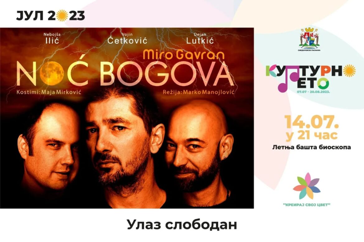 Poznata i priznata glumačka imena Vojin Ćetković, Dejan Lutkić i Nebojša Ilić, odigraće pred palanačkom publikom, predstavu “Noć Bogova”, po tekstu Mire Gavrana.