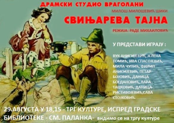 Dramski studio „Vragolani” iz Smederevske Palanke, prvi put će izvesti predstavu „Svinjareva tajna” u režiji Radeta Mihailovića u petak, 29. avgusta. Početak je zakazan za 18.15 časova na Trgu kulture.
