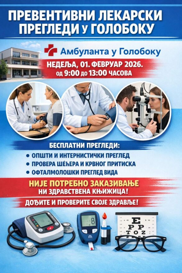 OB „Stefan Visoki” i Dom zdravlja u Smederevskoj Palanci, u nedelju, 1. februara 2026. godine, od 9 do 13 časova u prostorijama ambulante  u Goloboku sprovodiće preventivne lekarske preglede.