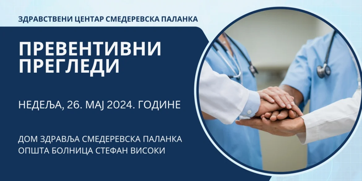 U nedelju, 26. maja 2024. godine, od 8 do 17 časova, u domu zdravlja i Bolnici Zdravstvenog centra Smederevska Palanka biće omogućeni besplatni preventivni pregledi za građanstvo.