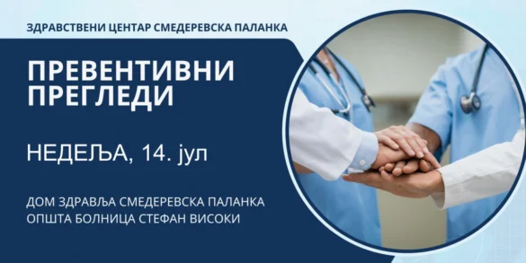 Akcija besplatnih preventivnih pregleda, koja se sprovodi u cilju rane dijagnostike i promocije prevencije bolesti, biće nastavljena u nedelju, 14. jula 2024. godine, u većini zdravstvenih ustanova u Srbiji, među kojima je i Zdravstveni centar Smederevska Palanka (Opšta bolnica Stefan Visoki i Dom zdravlja Smed. Palanka).