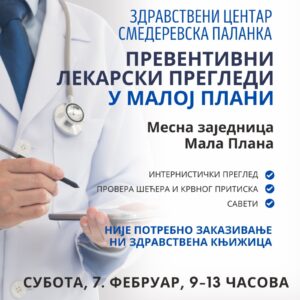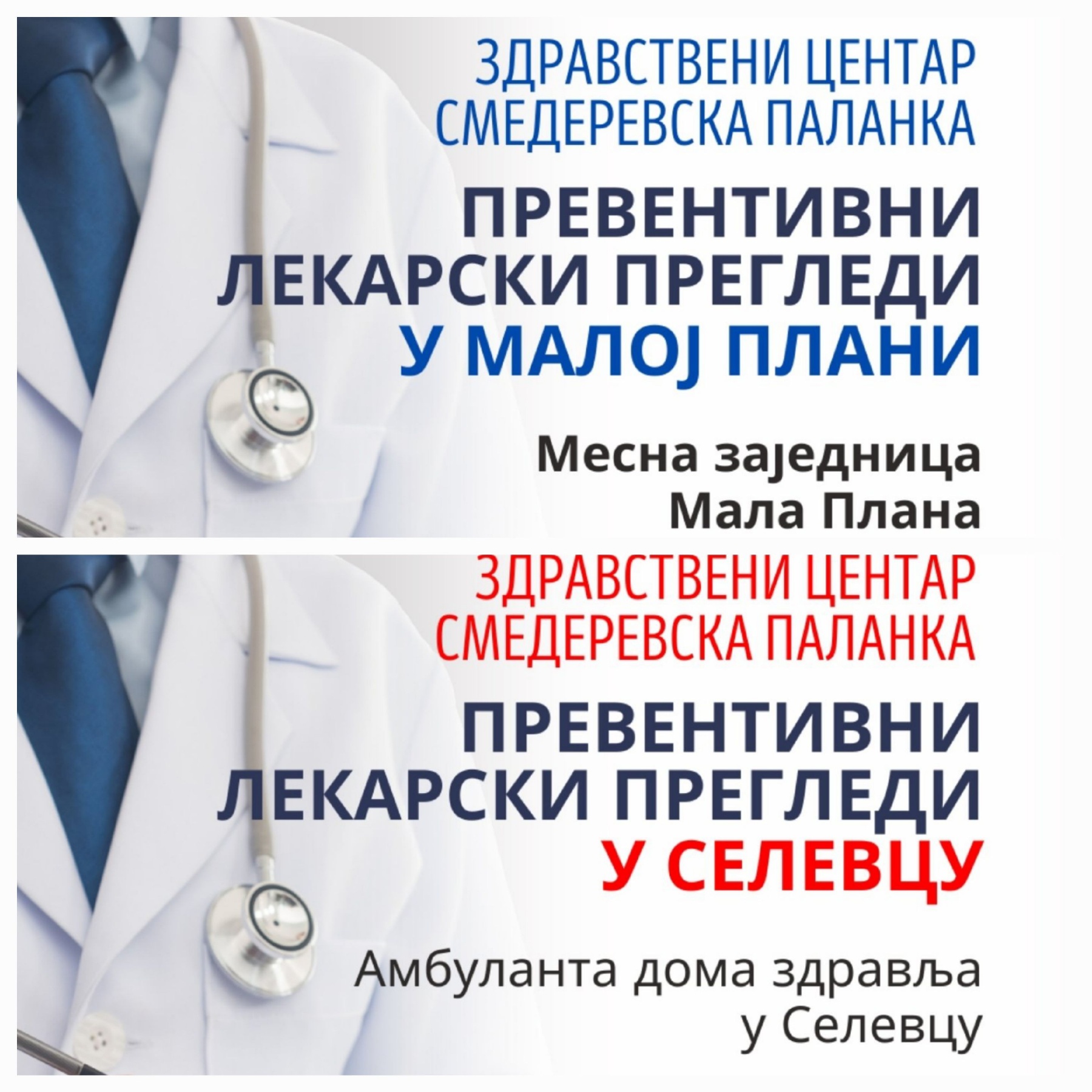Zdravstveni centar Smederevska Palanka predstojećeg vikenda nastavlja akciju preventivnih lekarskih pregleda za stanovnike Male Plane i Selevca.