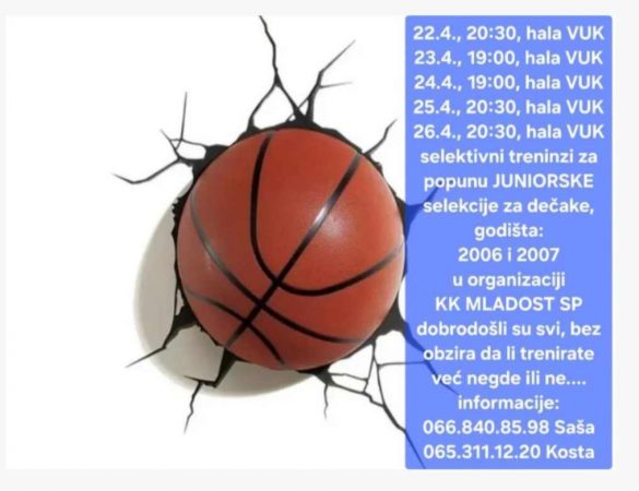 Škola košarke Košarkaškog kluba „Mladost SP” – prijave do 26. aprila