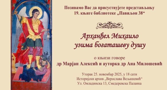 U Istorijskom arhivu „Veroslava Veljašević“ u Smederevskoj Palanci sutra, 25. novembra u 18 časova biće održana promocija 19. knjige biblioteke „Paviljon 38“ pod naslovom „Arhanđel Mihailo uzima bogataševu dušu“.