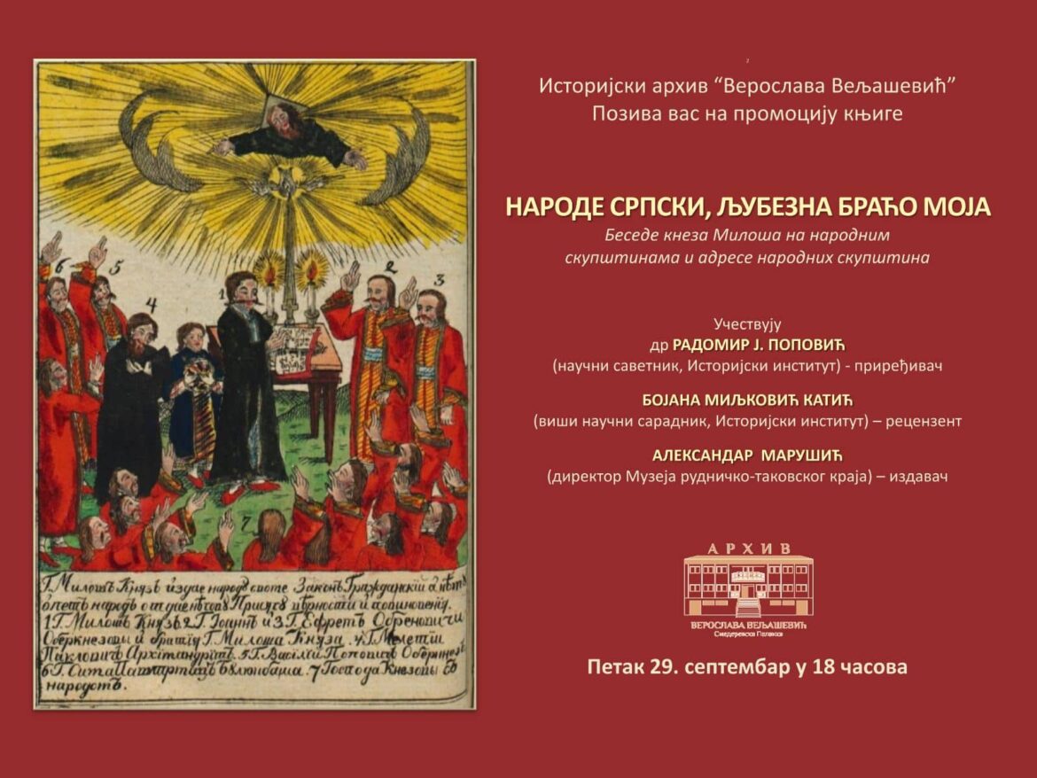 Istorijski arhiv “Veroslava Veljašević” u Smederevskoj Palanci organizuje promociju knjige “Narode srpski, ljubezna braćo moja” -besede kneza Miloša na narodnim skupštinama i adrese narodnih skupština, koju je priredio dr Radomir Popović, naučni savetnik Istorijskog instituta u Beogradu.