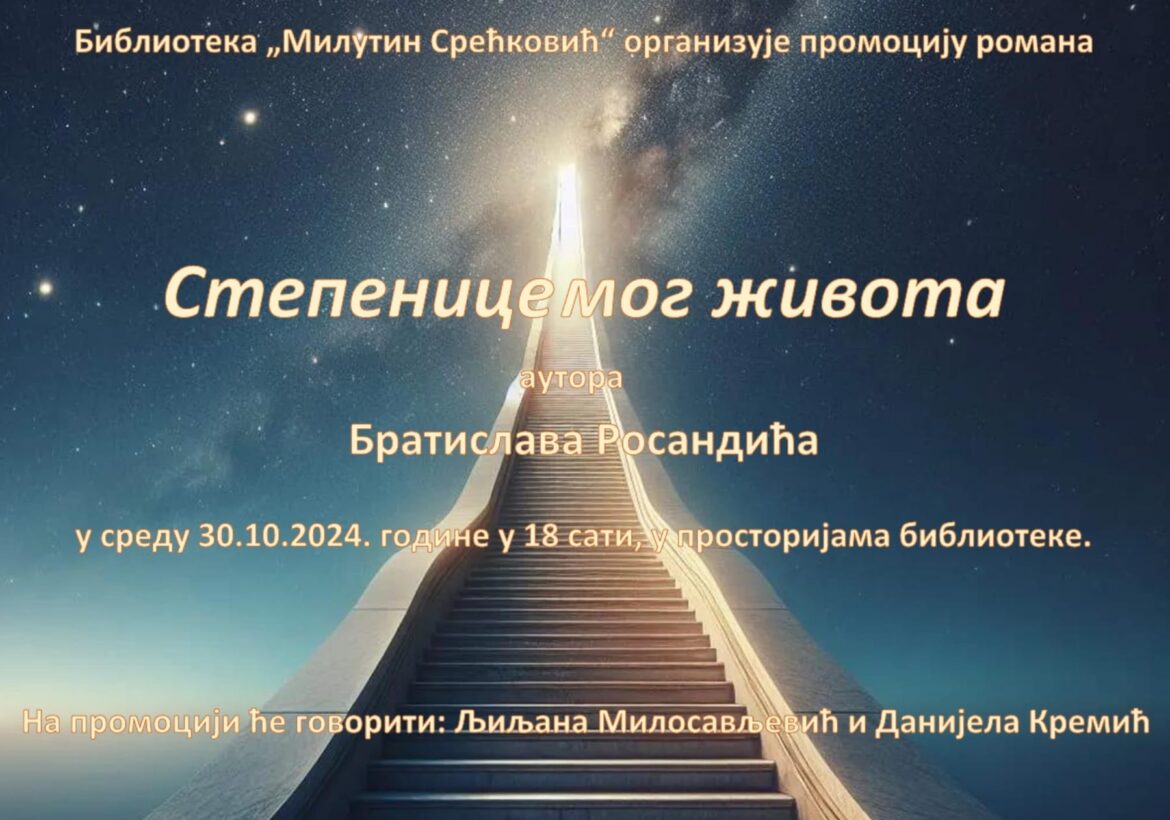 U organizaciji Biblioteke „Milutin Srećković“ i KK „21“, sutra 30. oktobra, u prostorijama biblioteke biće održana promocija novog romana Bratisalava Rosandića pod nazivom „Stepenice mog života“. Promocija je zakazana za 18 časova.