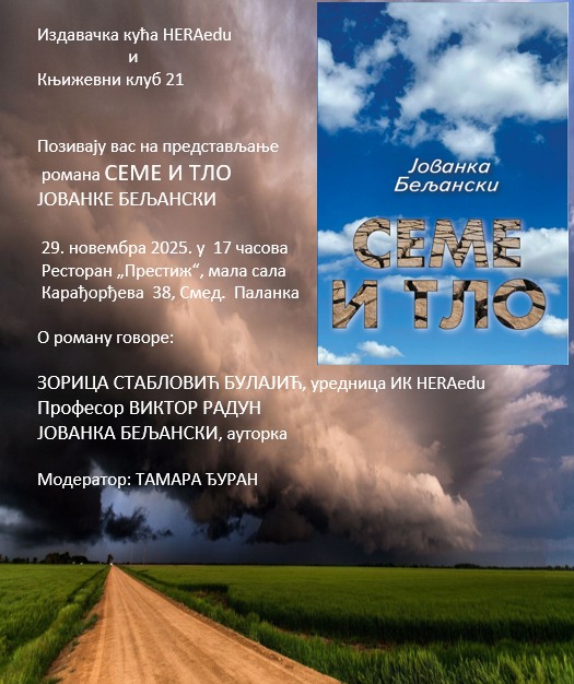 Izdavačka kuća HERAedu i Književni klub 21 pozivaju sve ljubitelje pisane reči na promociju romana „Seme i tlo” Jovanke Beljanski.