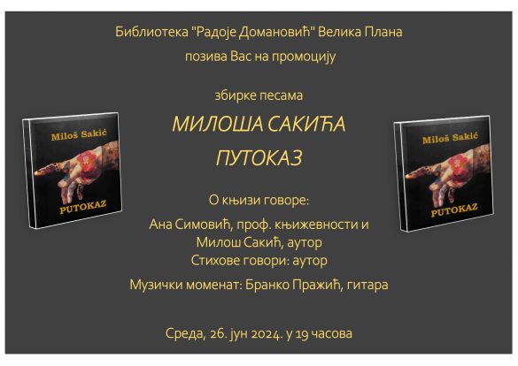 Biblioteka „Radoje Domanović” Velika Plana poziva sve ljubitelje književnosti na promociju zbirke pesama Miloša Sakića „Putokaz”.
