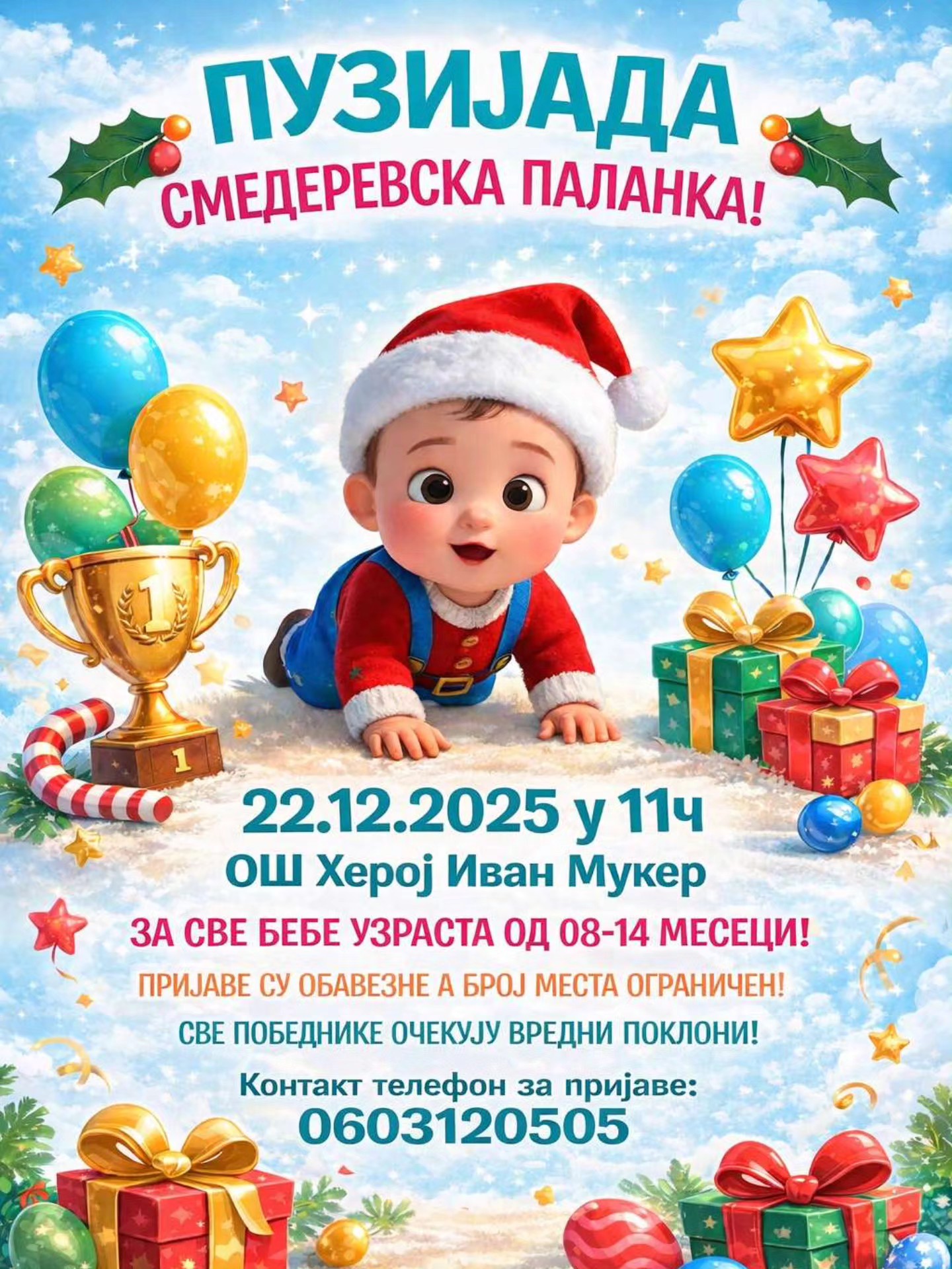 U ponedeljak, 22. decembra, u 11 časova, u fiskulturnoj sali OŠ „Heroj Ivan Muker“, u organizaciji Ministarstva za brigu o porodici i demografiju i Opštine Smederevska Palanka, biće održana prva Puzijada namenjena deci uzrasta od 8 do 14 meseci.