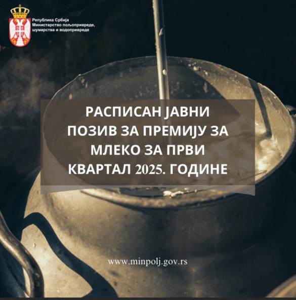Uprava za agrarna plaćanja Ministarstva poljoprivrede, šumarstva i vodoprivrede raspisala je javni poziv za podnošenje zahteva za ostvarivanje prava na premiju za mleko za prvi kvartal 2025. godine, a zahtevi mogu da se podnose do 30. aprila preko platforme eAgrar, odnosno portala ePodsticaji, objavila je ova uprava.