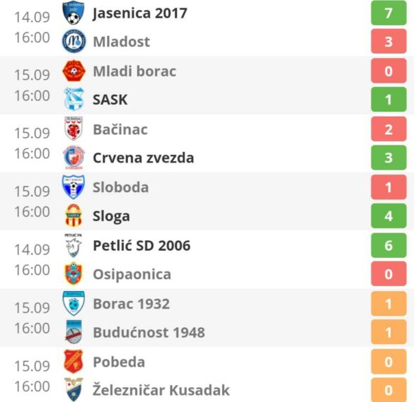 Na tabeli prva je Sloga sa 12 bodova, dzga je Pobeda sa 10, Železničar je treći sa 10, Budućnost je peta sa 8, Jasenica 2017 zauzima osmu poziciju sa 4 boda dok je Bačinac 12 sa 3 boda.