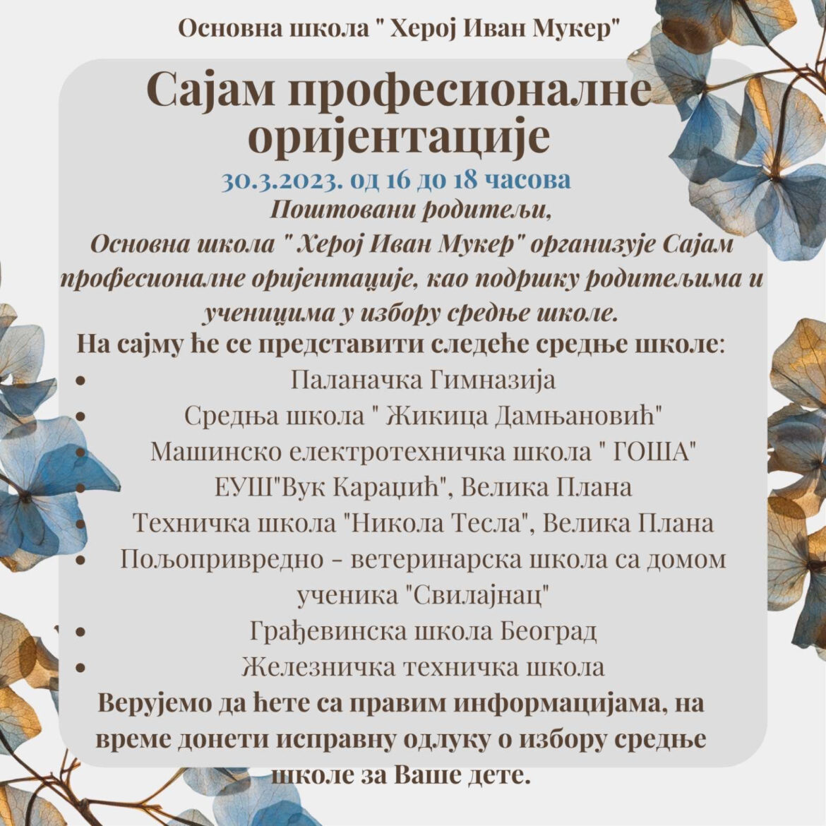 U organizaciji OŠ „Heroj Ivan Muker“ u četvrtak, 30. marta, od 16 do 18 časova biće održan Sajam profesionalne orijentacije, kao podrška roditeljima i učenicima u izboru srednje škole.