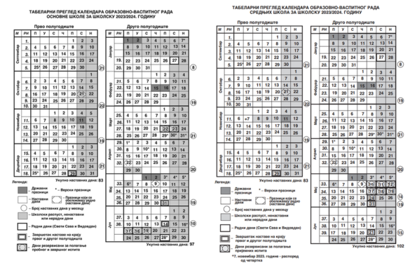 Prvo polugodište će trajati do 29. decembra. Drugo polugodište počeće 22. januara 2024. godine.