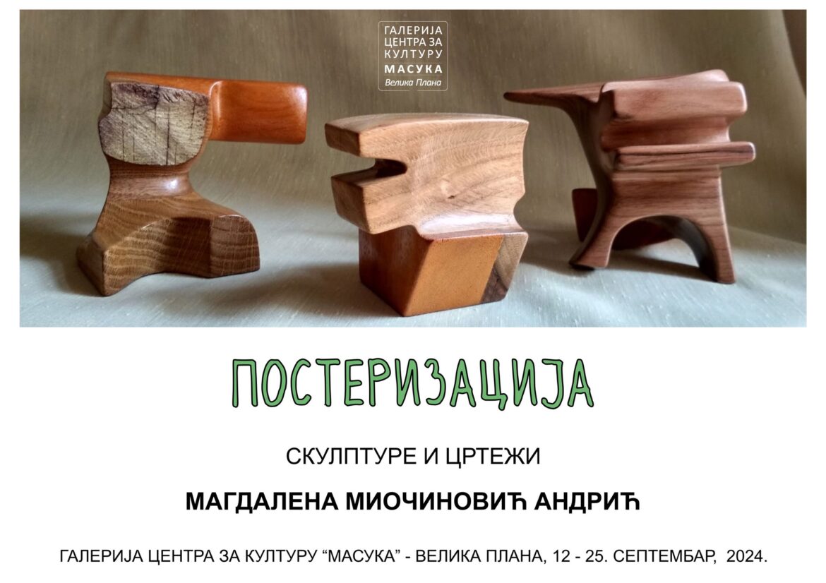U Galeriji Centra za kulturu Masuka u Velikoj Plani sutra, 12. septembra, svečano će biti otvorena izložba skulptura i crteža pod nazivom Posterizacija, autora Magdalene Miočinović Andrić.