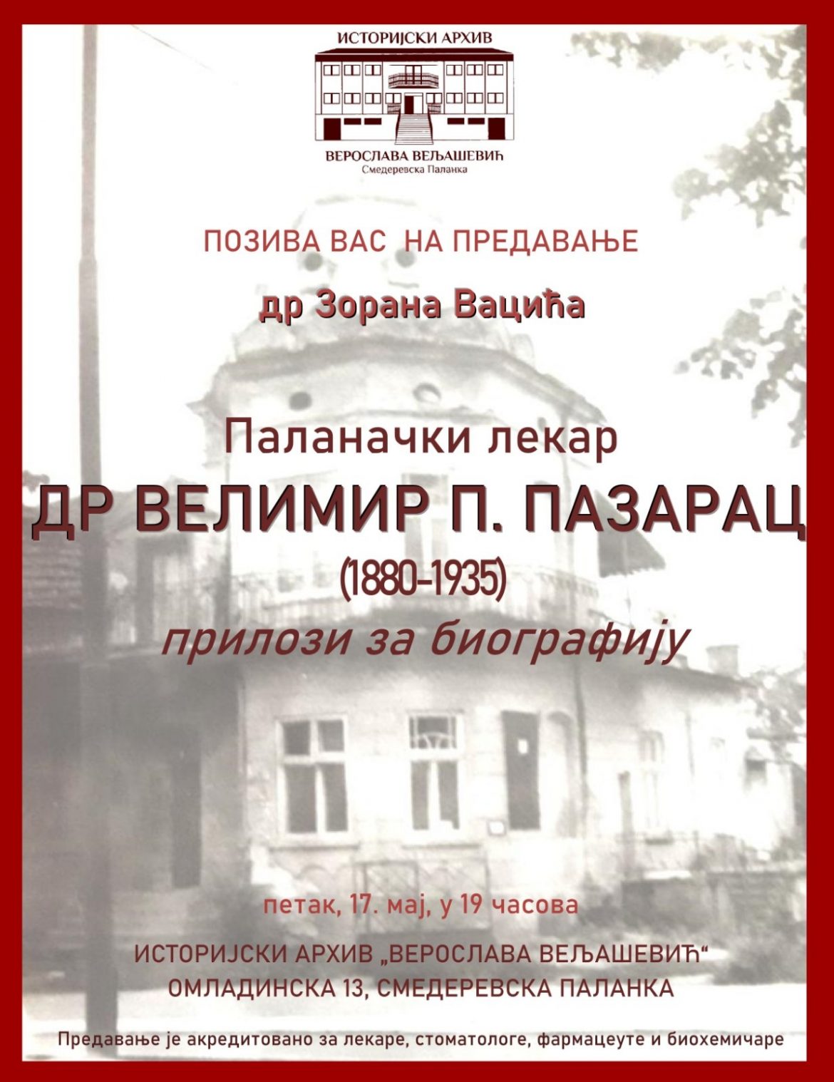 Istorijski arhiv „Veroslava Veljašević“ vas poziva na predavanje Dr Zorana Vacića „Palanački lekar dr Velimir P. Pazarac (1880-1935)“.