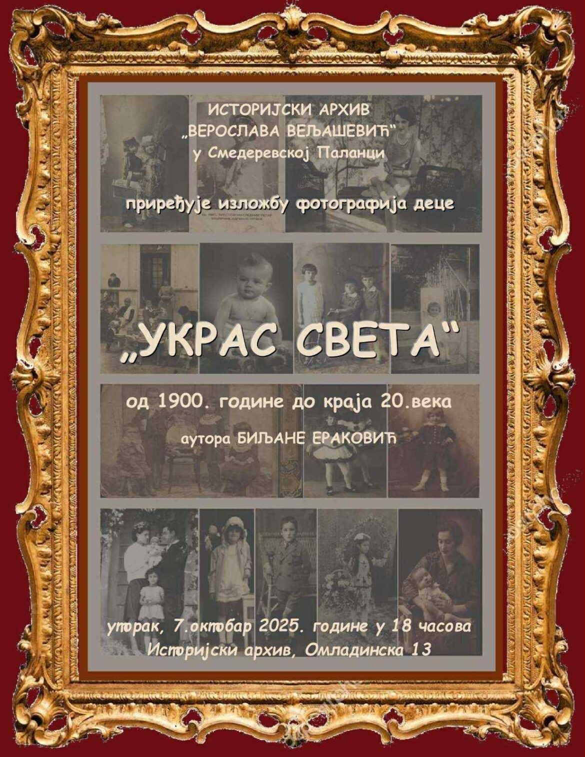 Istorijski arhiv „Veroslava Veljašević“ u Smederevskoj Palanci priređuje izložbu fotografija dece pod nazivom „Ukras sveta“, autorke Biljane Eraković. Postavka obuhvata fotografije nastale u periodu od 1900. godine do kraja 20. veka, predstavljajući dragocenu vizuelnu hroniku detinjstva kroz vreme.