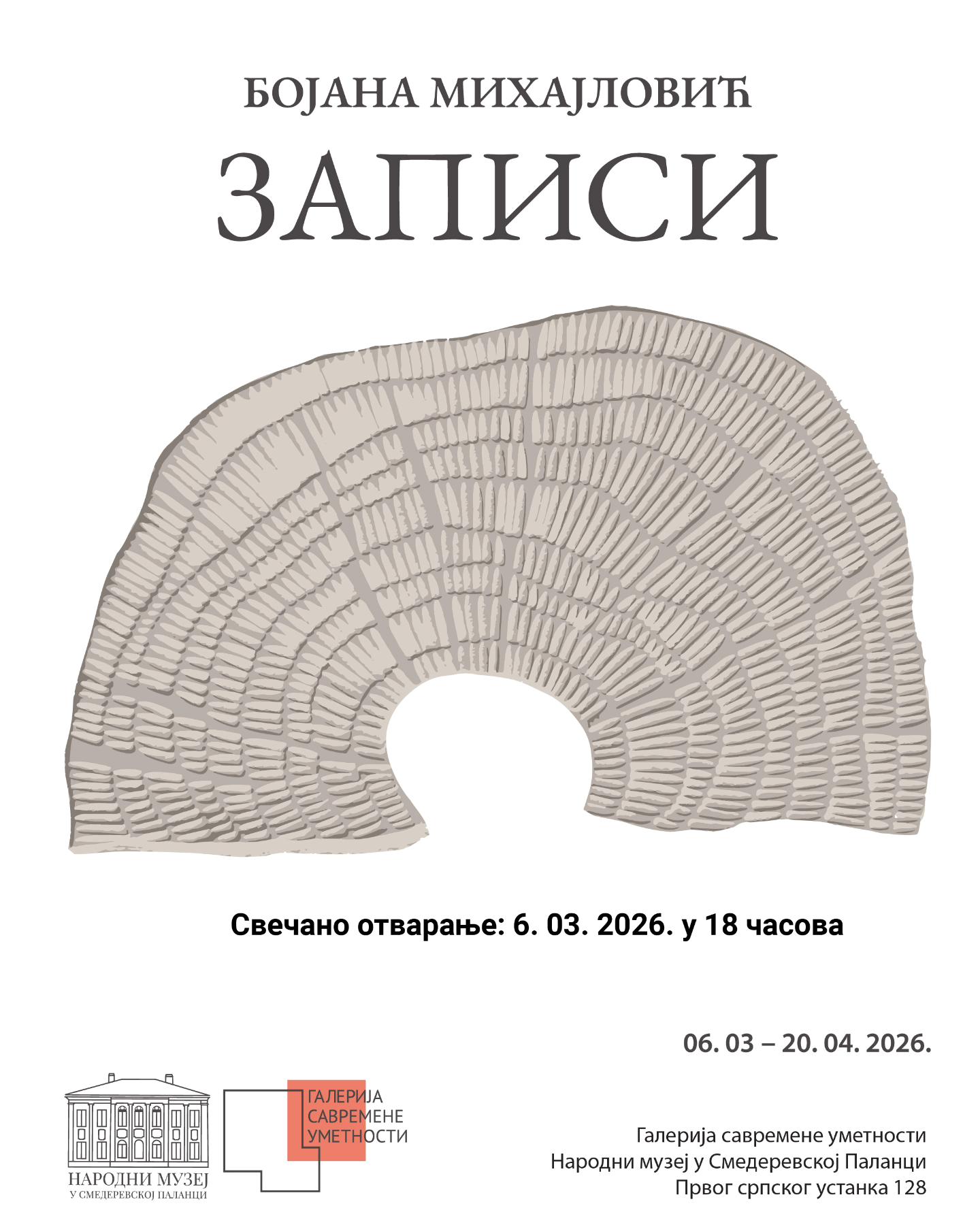 Svečano otvaranje izložbe grafika pod nazivom „Zapisi” autorke Bojane Mihajlović, zakazano je za petak, 6. marta 2026. godine u 18 časova, u Galeriji savremene umetnosti u Smederevskoj Palanci.