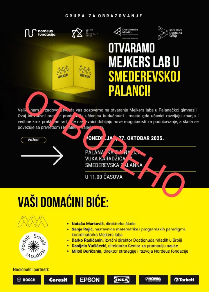 Posebnu zahvalnost škola je uputila Grupi za obrazovanje — organizacijama Dostignuća mladih, Centru za promociju nauke, Inicijativi Digitalna Srbija i Nordeus fondaciji, koje su omogućile da Palanačka gimnazija postane deo šire Mejkers zajednice.