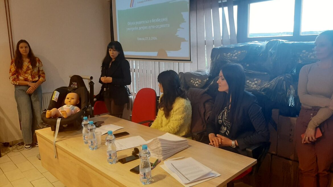 U Topoli je u Sali vizitorskog centra održana obuka o pravilnom korišćenju dečijih auto sedišta, a potom je dodeljeno 66 auto sedišta roditeljima koji su zahteve podneli do 16. januara ove godine.