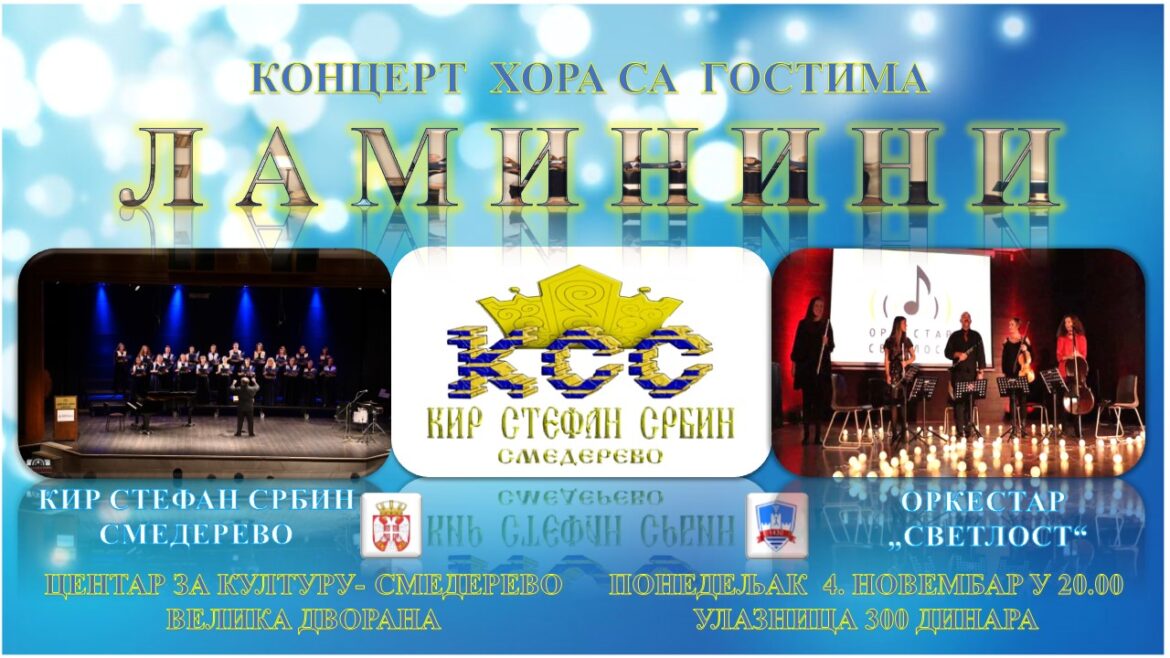 Nakon gostovanja u Republici Grčkoj i koncerta u Pragu- Češka Republika hor Kir Stefan Srbin održaće koncert u Smederevu u okviru priprema za predstojeću turneju u Narodnoj Republici Kini. Na koncertu će biti izveden deo programa koji hor priprema za predstojeću turneju, širok repertoar koji obuhvata duhovnu muziku, kompozicije folklornog karaktera koje najbolje predstavljaju svo bogatstvo melodike i ritma Srbije i ljudi koji žive na ovim prostorima, kompozicije različitih žanrova i krajeva sveta. Na koncertu kao gost nastupa „Orkestar svetlost” koji će predstaviti deo svog bogatog repertoara i vrhunskog izvođenja svojih kompozicija. Sam naziv koncerta “LAMININI” je ono što sve izvođače sa koncertnim repertoarom i prisutni auditorijum čini jedinstvenim zahvaljući muzici koja nalazi put do svakog od nas.